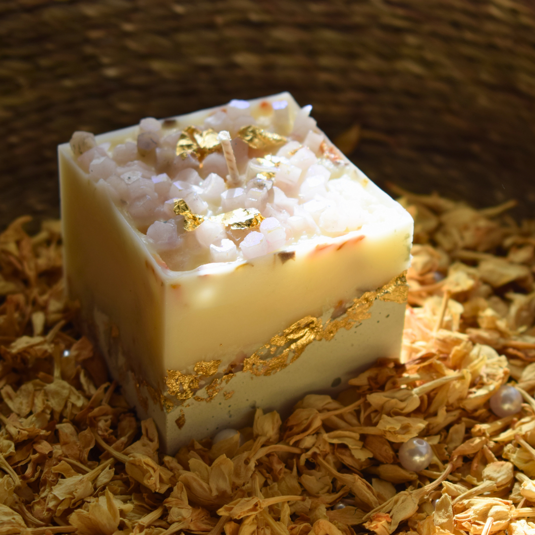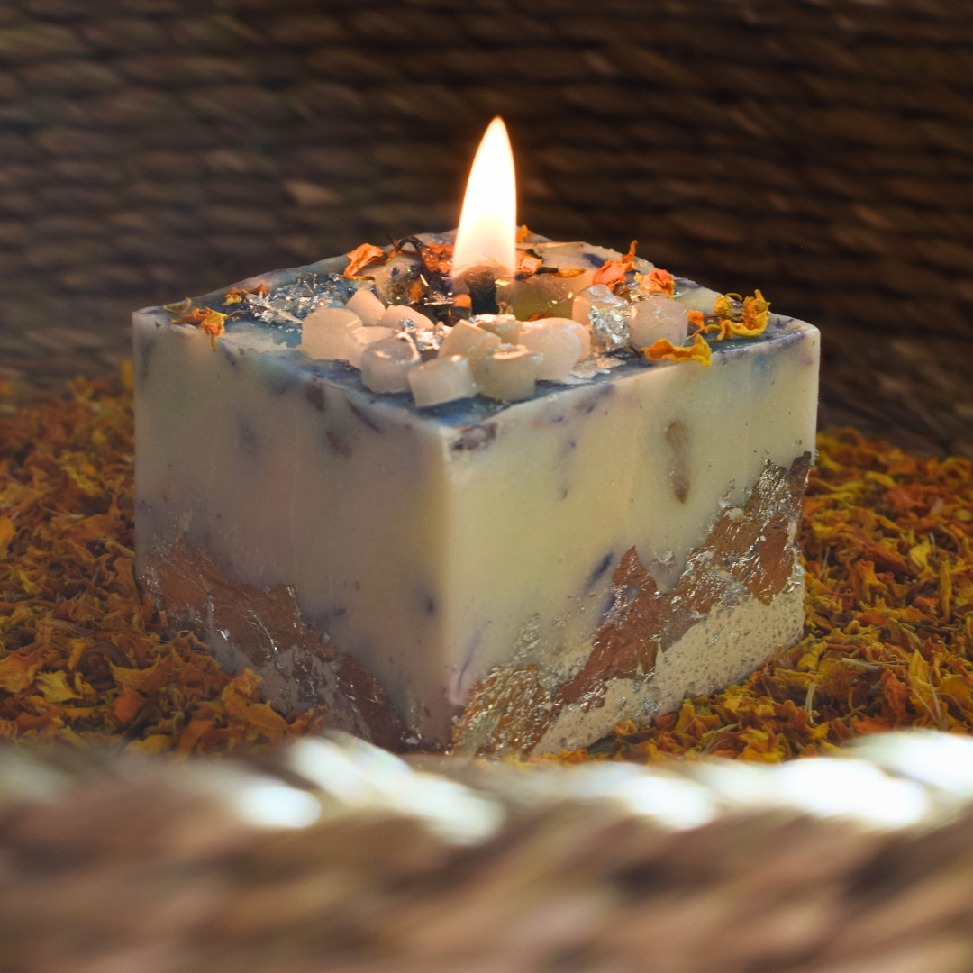 Each candle is meticulously crafted with a solid concrete base, hand-applied gold leafing, and topped with premium soy wax for a clean, long-lasting burn. Infused with dried marigold petals, this candle brings a touch of nature’s charm to your space.